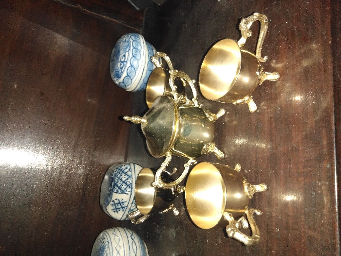 This image, captured in Astana, Kazakhstan, depicts a static display of decorative objects on a dark brown, polished wooden surface. The primary subjects are a miniature, ornamental five-piece golden-colored metallic tea or coffee set and three small, spherical white and blue patterned ceramic containers. The metallic set comprises a central lidded pot with two ornate handles, a finial, and four feet, flanked by four individual cups, each with a single handle and three feet. All metallic components exhibit a polished golden finish. The ceramic containers include one partially visible on the far left, a second on the left with a blue grid and hash-like pattern, and a third on the right with a repeating blue scallop design. The background consists of a dark brown wooden panel, reflecting a prominent vertical light source. Minor dust is visible on the display surfaces. No individuals, actions, or interactions are present.