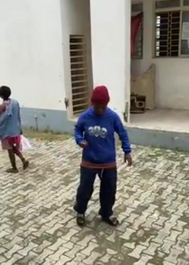 person in a blue hoodie with a skull graphic, dark pants, and a burgundy beanie dancing on a paved area. The person is wearing sandals. They are facing the camera and performing various dance moves. In the background, there's a white building with windows and a doorway visible. Another person, wearing a dress and denim jacket, walks in the background, slightly out of focus. The paved area consists of a pattern of interlocking stones. The lighting is somewhat overcast.