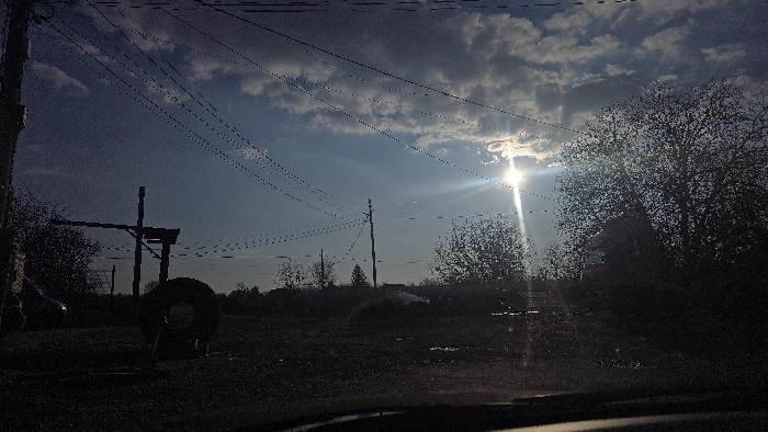 This image depicts an outdoor scene in Kostinbrod, Bulgaria, under a partially cloudy sky with the sun prominently visible and causing significant lens flare in the upper right quadrant. The scene is heavily backlit, silhouetting most foreground and midground elements. In the upper portion, multiple dark utility lines traverse the sky from the upper left, diagonally downwards, to the right. A tall, dark utility pole stands in the midground, left of center. To its left, a dark wooden structure, possibly a makeshift gate or support, is visible. In the immediate foreground, a large, dark tire lies flat on the ground. A dark-colored vehicle is partially visible on the far left, obscured by shadow. The ground is uneven, appearing unpaved or poorly maintained, with several small, dark puddles reflecting some light in the midground. Sparse trees with bare branches are visible across the midground and right, with a denser cluster on the far right obscuring an indistinct dark structure. No individuals are visible. The overall impression is of a semi-rural or industrial fringe area.