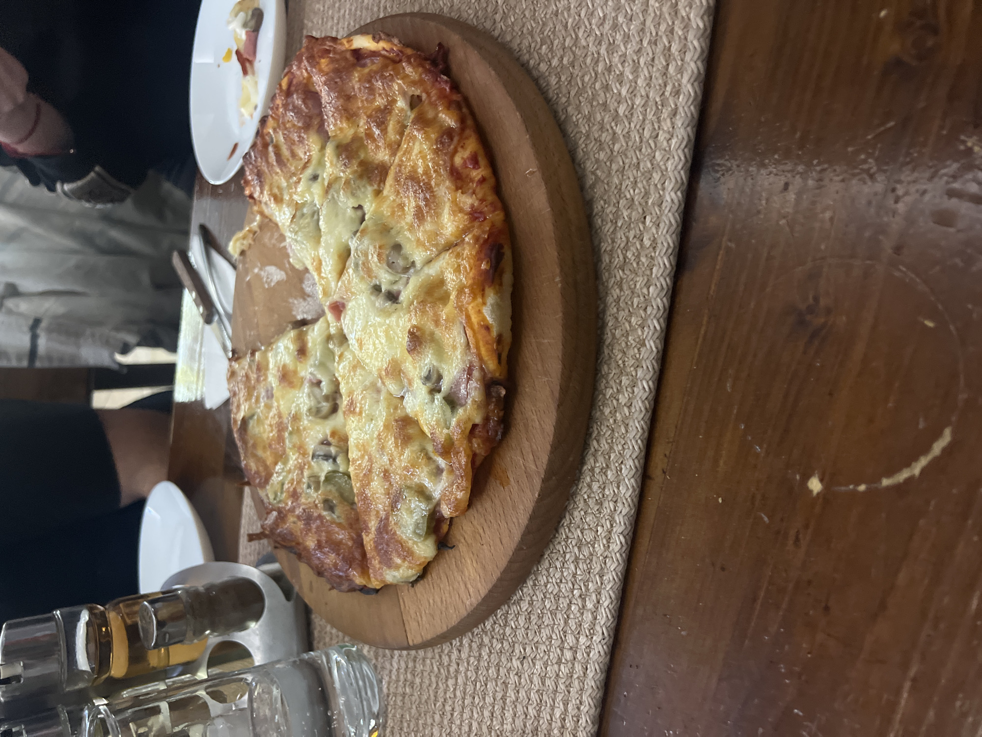 The scene depicts a dining table within a commercial establishment in Strazhitsa, Bulgaria. A circular pizza, approximately 12 inches in diameter and sectioned into eight slices, rests on a round wooden serving board. The pizza is topped with melted, golden-brown cheese, mushroom pieces, and other fragmented ingredients. The wooden board exhibits minor charring beneath the pizza crust. The table surface is dark brown wood with visible grain. A light brown, woven placemat is positioned beneath the pizza board. To the left, a tall, clear glass containing liquid is present, alongside a metal condiment holder containing three glass bottles; one contains amber liquid, another dark granular material, and the third is partially obscured. In the background, two white ceramic plates are visible. The plate on the left is empty, while the plate on the right contains food remnants including melted cheese, a yellow item, and a piece of processed meat. A knife with a dark handle and a fork are partially visible near this plate. Two individuals are partially visible in the background. To the left, a person wearing dark long-sleeved clothing is seen. To the right, another person, also in dark attire with a light-colored outer layer, displays an arm with a red wristband or bracelet.