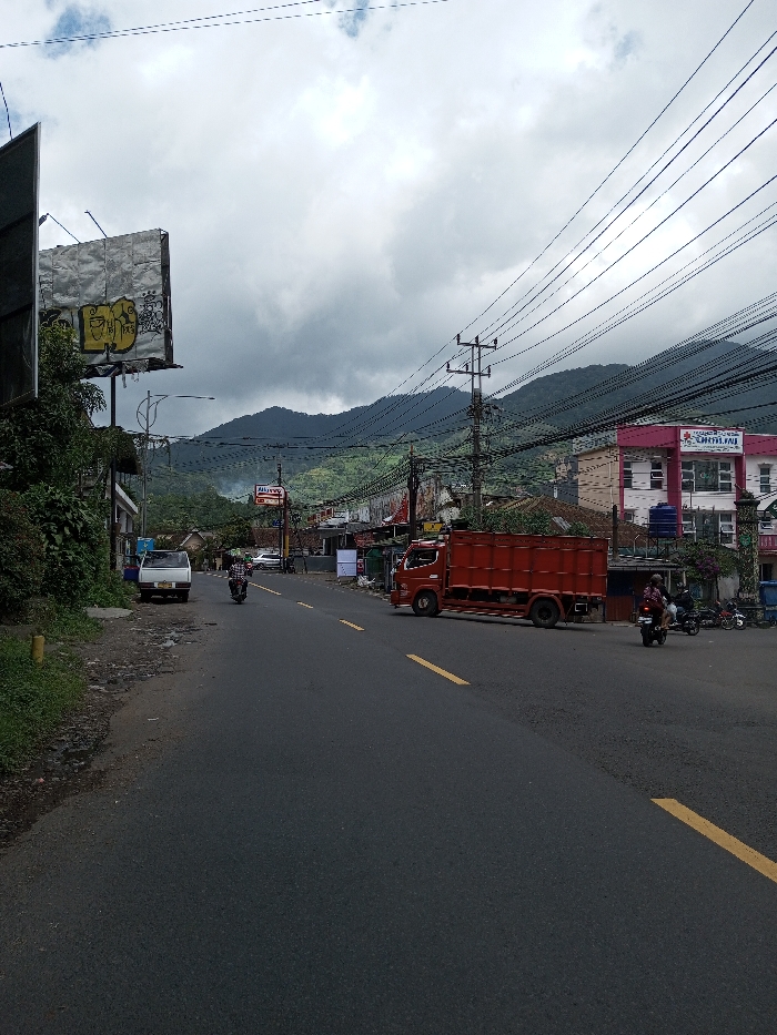 The image depicts a street scene in the city of Boommlog, Bhutan, under a heavily overcast sky with dense grey clouds. In the background, multiple layers of green, forested mountains are visible. A dark asphalt road runs through the center of the frame, marked with a double yellow solid line in the middle and a broken yellow line on the right lane. On the left side of the road, a dirt shoulder with sparse vegetation and two short yellow bollards precedes a large, weathered billboard made of corrugated metal, featuring yellow and black graffiti. A white van is parked on this shoulder, facing away from the camera. A lone motorcyclist, dressed in a plaid shirt, is riding towards the camera in the left lane. In the mid-ground, a red truck with a high-sided cargo bed, filled with what appears to be green foliage or waste, is driving from right to left across the road. Further down the road on the right, another motorcyclist is visible, moving away from the camera. The right side of the street is lined with buildings. A prominent two-story structure with a pink upper facade and a white ground floor stands closest, displaying a partially obscured sign on its upper level that includes the text "CINTAMU" or "CHINTAMI." A blue waste bin is situated near this building, and several motorcycles are parked along the curb. Further along this side, additional commercial buildings are visible, one featuring a red and white sign. Numerous utility poles and a dense network of overhead power and communication lines traverse the upper portion of the scene above the buildings.