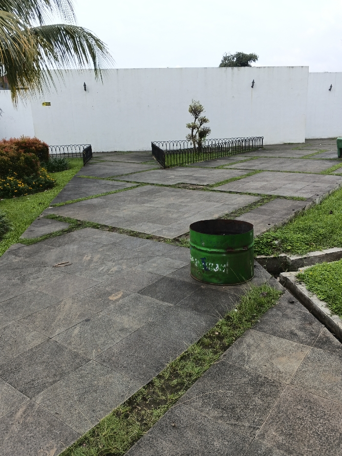 The image displays an outdoor paved area in thành phố Biên Hòa, Vietnam, under an overcast sky. The ground is primarily covered with large, square, grey paving stones, with narrow strips of green grass growing in the interstices. A linear drainage channel, also with grass, runs along the right side of the paved section. In the foreground-right, a cylindrical, cut-off green metal drum, appearing weathered and rusted with remnants of light-colored text, rests on the paving. To the left, a dense, manicured bush with reddish-brown foliage and visible yellow flowers borders the pathway. Further back, a small, multi-trunked tree, possibly sculpted, is enclosed by a low, curved black metal fence. Two additional sections of similar black metal fencing define an opening or path segment to the left of the tree. The background is dominated by a long, plain white wall, exhibiting minor staining and weathering. Small, dark fixtures are mounted intermittently along the top edge of the wall, and a yellow warning sign is partially visible on the wall's left portion. Palm fronds extend into the upper-left of the frame from an unseen tree. No individuals, actions, or direct interactions are depicted in the scene.