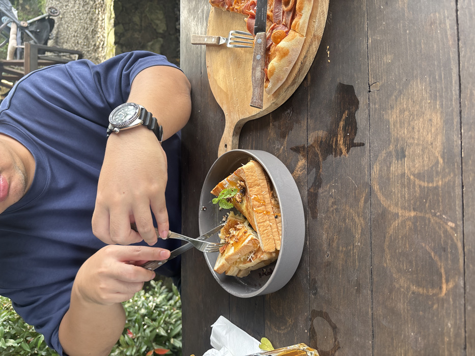 An individual, clad in a dark blue short-sleeved top and a silver-toned wristwatch with a black band on the left wrist, is depicted seated at a dark brown wooden plank table in an outdoor dining environment in Tamiajeng, Indonesia. The person's hands are centered, actively utilizing a knife in the right hand and a fork in the left to cut food within a grey circular pan. This pan contains three triangular sections of what appears to be toast or French toast, garnished with a light drizzle, a granular topping, and a sprig of mint. To the right, on the same table, an irregularly shaped wooden cutting board holds two slices of pizza, topped with sliced meat. A separate knife and fork with wooden handles are resting on this pizza board. The dark wooden table surface exhibits multiple water rings and marks. The background features green foliage directly behind the individual, with a stone wall and indistinct structures visible further back.