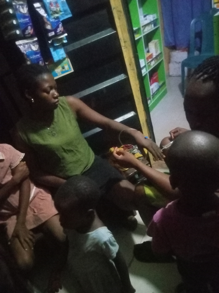 In a dimly lit space, a woman in a green top and black skirt sits surrounded by children. A child in a pink shirt faces away from the camera. Another child in a light blue shirt stands nearby. To the left, a child wears a striped dress. The woman reaches out to offer something from a small bowl. A bookshelf with various items on display and a green shelving unit are visible in the background.