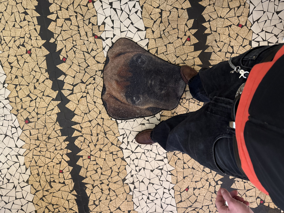 An overhead view captures the lower torso and legs of an individual standing on a mosaic floor in Boulogne-Billancourt, France. The person wears dark denim trousers, a red belt, and brown slip-on shoes. A silver chain with a carabiner-style clasp is affixed to the right hip of the trousers. The left hand is visible, positioned near the left hip. The floor is covered in a mosaic comprising irregularly shaped tiles: light gold-beige, white, and a prominent jagged black line. Small, square red tiles are randomly embedded within the gold-beige sections. Adjacent to the individual's right foot, a rug shaped and printed with the head of a brindle Boxer puppy rests on the mosaic surface.
