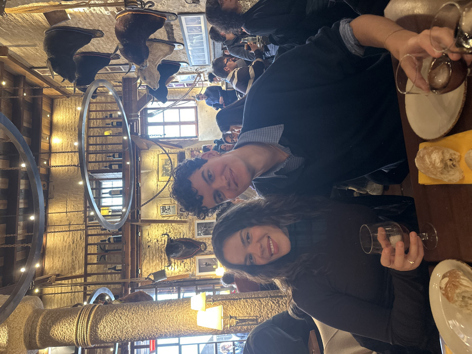 Two individuals are seated at a dark wooden table in a rustic restaurant identified as El Caballo de Troya in Sevilla, Spain