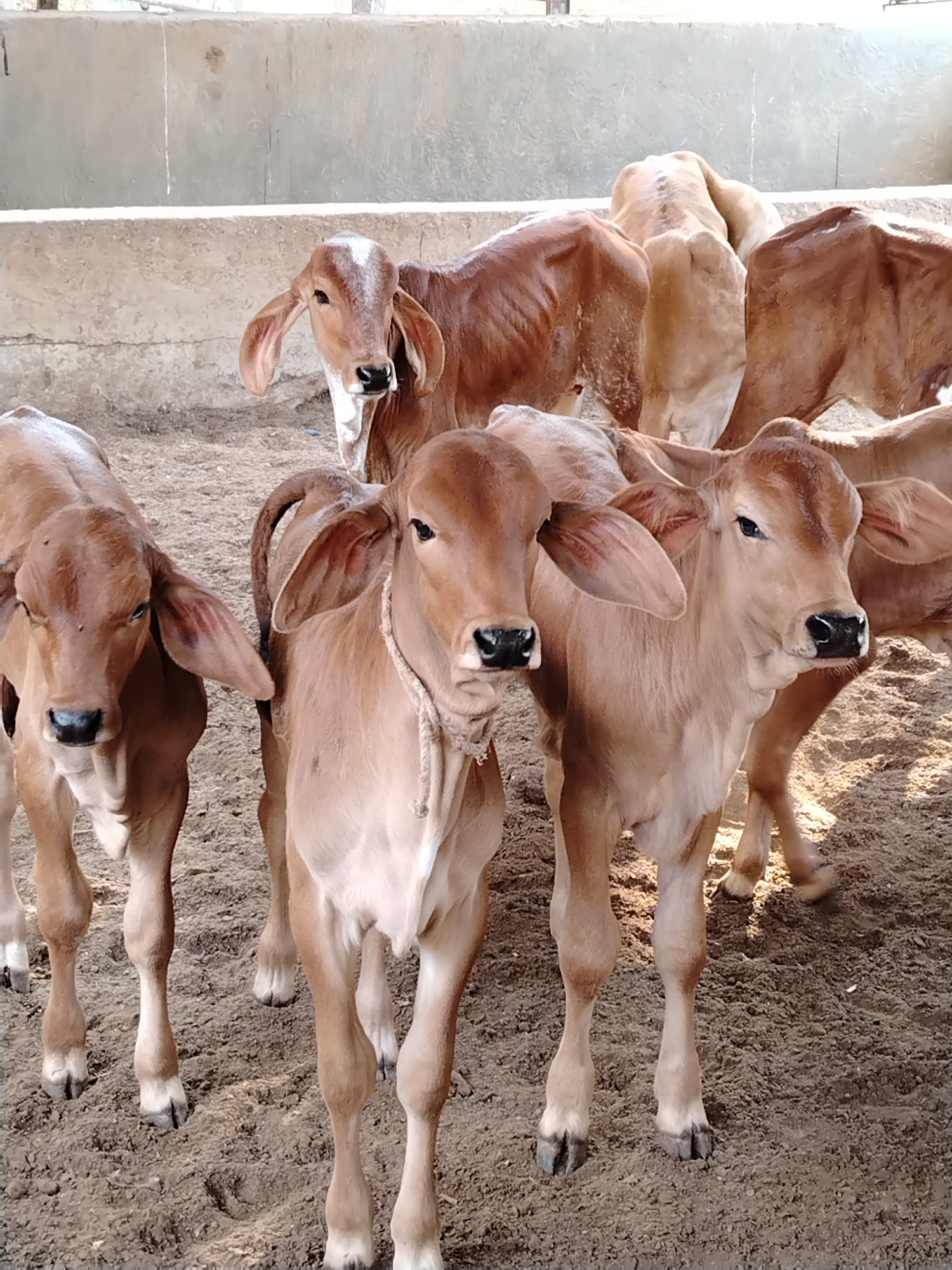 A medium shot shows a group of six calves standing in a sandy enclosure