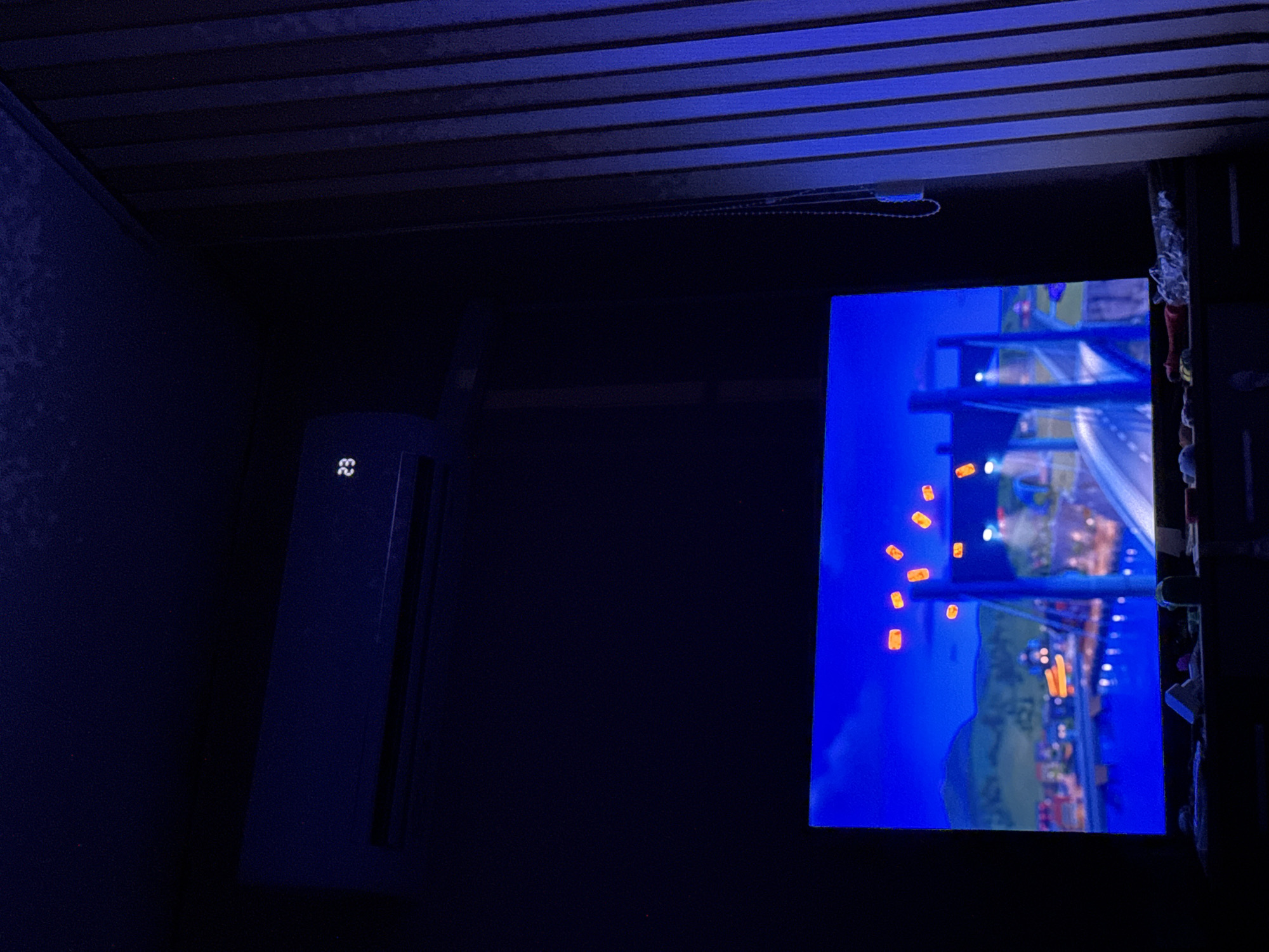 The scene depicts a dimly lit interior room in Lom, Bulgaria, with a prominent television and an air conditioning unit. A dark, wall-mounted air conditioning unit is located in the upper left portion of the frame, displaying the digital number "23". To the right, vertical blinds or curtains extend downwards, illuminated with a blue hue. A large television screen occupies the lower half of the image, displaying a vibrant, animated or video game scene. This scene features a bright blue sky, distant green mountains, a body of water, a waterfront town with illuminated buildings, and a prominent suspension bridge with active streetlights. Approximately a dozen glowing orange rectangular objects are suspended in the sky above the bridge. Beneath the television, a dark, flat surface, likely a media console, holds several indistinct items, including crumpled plastic and small, light-colored objects. No individuals are present in the image.