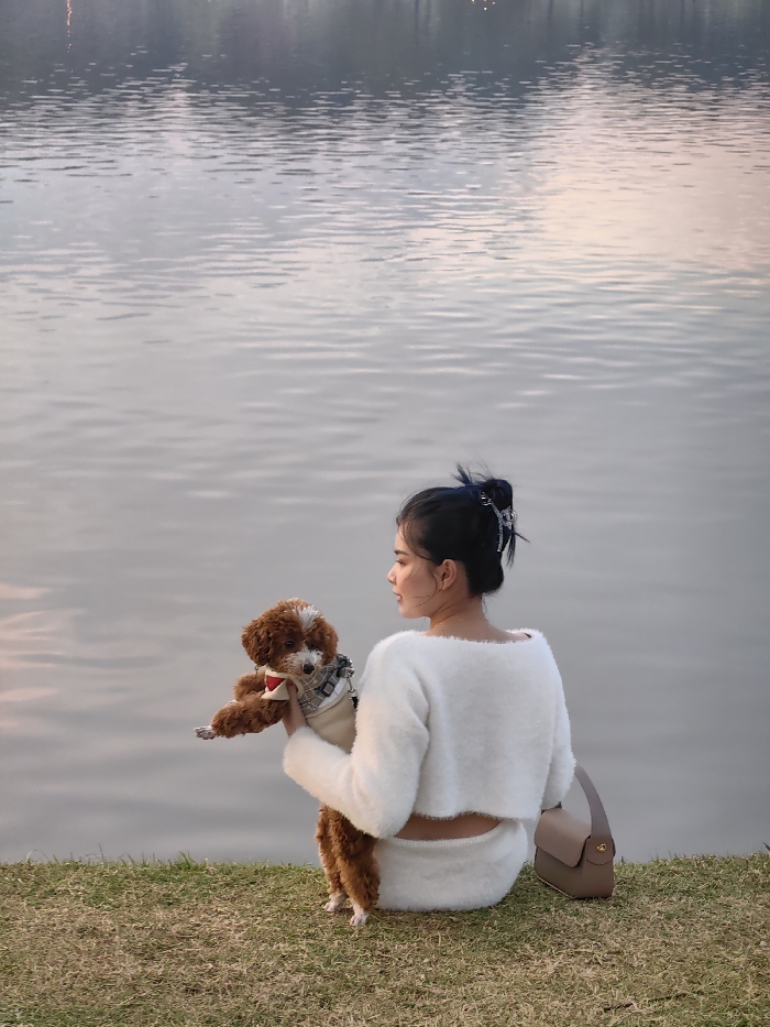 An adult female is seated on dry, patchy grass at the edge of a large body of water, consistent with Xuan Huong Lake in Da Lat, Vietnam. She faces partially away from the camera, looking towards the left frame edge. Her dark hair is pulled up with a claw clip. She is dressed in a white, fluffy, cropped long-sleeved top and a matching skirt. In her arms, she holds a small, light brown and white poodle-type dog, which wears a plaid harness with a red detail. The dog is also oriented towards the left, looking out over the water. A light brown handbag with a prominent gold-toned clasp rests on the grass to her right. The water surface displays minor ripples and reflects a diffused, pale light, suggesting dusk or dawn. Indistinct dark forms, likely distant shore features, are vaguely visible across the water.