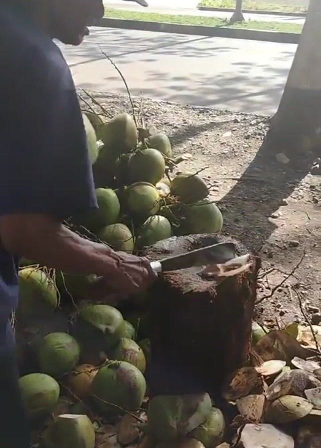 A man is seen standing beside a tree and a pile of green coconuts. He is wearing a blue shirt, black pants, and a black baseball cap. He's using a large machete to chop the top off of one of the coconuts, which is resting on a dark-colored tree stump. Several opened coconut husks are scattered on the ground. Cars and motorcycles can be seen passing by on the road in the background. The scene appears to be a roadside vendor preparing coconuts for sale.