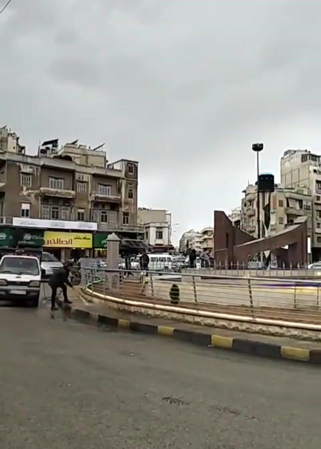 man cleaning a street area in a city. The man, wearing a dark jacket, is standing on the edge of a raised traffic island or curb and using a green hose to spray water and clean the surrounding area. The area being cleaned appears to be a small garden or decorative part of the traffic island, enclosed by a metal railing with a yellow and black curb. Several buildings are visible in the background, indicating an urban environment. The buildings are a mix of residential and commercial structures. One building has a sign in Arabic script. A few parked cars are visible, including a white van. Other people can be seen in the background, walking or standing. The sky is overcast and grey, suggesting a cloudy day. The overall scene is of a routine cleaning activity in a cityscape.