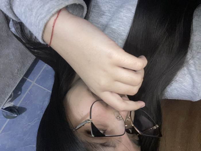 The image depicts a close-up, angled view of an individual located in an indoor setting in Cotoperíz, Venezuela. The subject is a female with long, straight, dark hair, wearing a light gray long-sleeved top and eyeglasses with dark, cat-eye style frames featuring gold-colored metallic accents. Her right hand is raised, with fingers partially obscuring her nose and mouth area. A thin red string bracelet is visible on her right wrist. The individual is looking towards the viewer. The background on the right features a wall covered in blue rectangular tiles with white grout lines. A round, metallic fixture, possibly a faucet handle, is affixed to this tiled wall. A dark gray surface or object is partially visible on the far right, adjacent to the tiled wall.