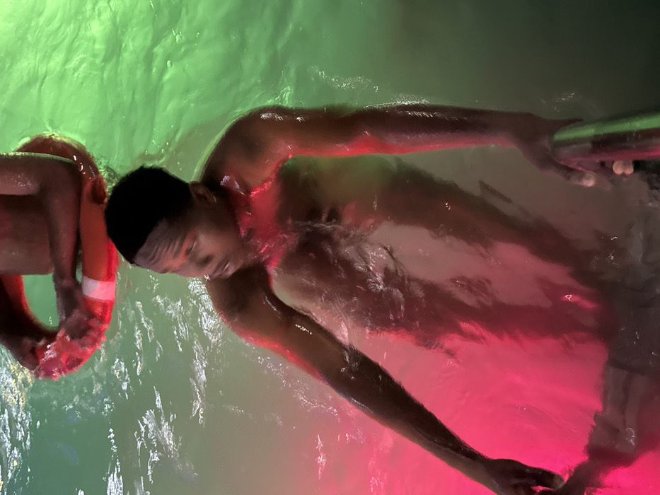 A man is chest deep in water, holding a metal railing. The water is illuminated by green and red lights, giving it a surreal, colorful appearance. His head is down and eyes are closed. To the left, another person is also in the water, wearing an orange and white life preserver. The water's surface is reflective and somewhat blurred, obscuring the details of the pool or surrounding environment.