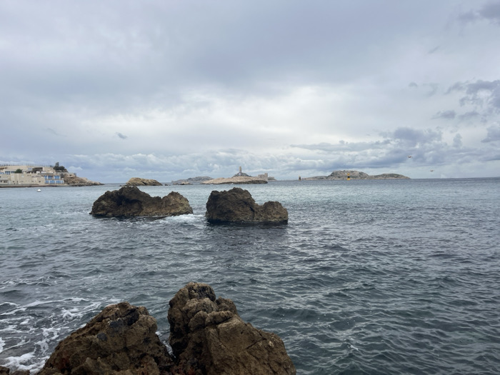 This forensic description details a coastal scene off Marseille, France, on an overcast day. The foreground shows several large, dark brown rocks emerging from the rippled, dark blue-green sea, with white foam visible around their bases. In the midground, the Mediterranean Sea extends, dotted with smaller rocky islets and a white buoy to the far left. The background reveals a low-lying, light-colored building complex with blue architectural accents on a landmass to the left, likely part of the mainland coast. Stretching across the distant horizon, a series of rocky islands is visible. Centrally located on one of the furthest islands is the prominent Phare de Planier (Planier Lighthouse), characterized by its white conical structure. Another island to the right displays a low-profile structure with yellow markings. The entire sky is covered by a dense, uniform layer of grey clouds. No people or specific actions are depicted.