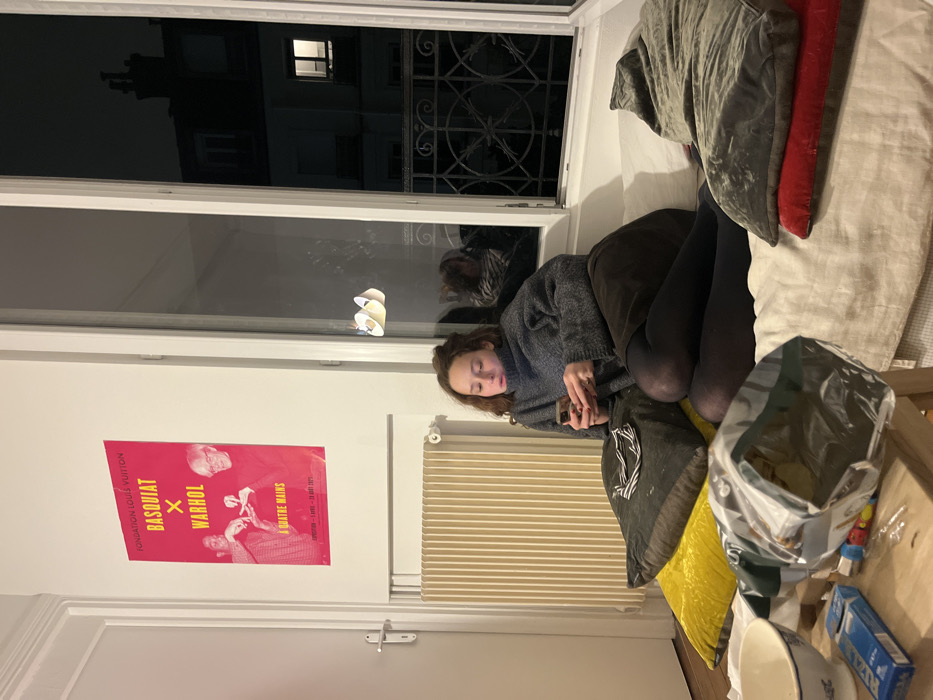 The image displays an indoor night scene within an apartment, confirmed by the "FONDATION LOUIS VUITTON BASQUIAT X WARHOL" exhibition poster to be in Paris, France. A young adult female, with light brown, curly hair, is centrally positioned, seated on a makeshift lounge area composed of a bed or daybed covered with a light linen sheet, supported by multiple pillows (dark grey, yellow, and red). She wears a grey turtleneck sweater, a dark brown skirt, and opaque dark tights, and is intently focused on a smartphone held in both hands. Her mouth is slightly agape. To her left, a light-colored wooden table or stool holds an empty white bowl with blue patterns, a blue cigarette pack-like item, and a small plastic bag with colorful objects. An open, large metallic-lined snack bag rests on the table, facing the viewer. On a dark grey pillow next to the woman, a coiled, white and dark striped object is present. The background features a white wall with a white door on the left, below which is a ribbed, light-colored radiator. Above the radiator, the red "BASQUIAT X WARHOL" poster is affixed. To the right, a large multi-pane window reveals a dark exterior, indicating nighttime. Across the street, the silhouette of a classic Parisian building with a prominent chimney stack is visible, and one window emits a warm light. A wrought-iron balcony railing is discernible at the lower part of the window. Reflections of the room's interior, including a partial reflection of the woman, are present on the window glass, along with a pair of small, light-colored decorative elements. The room is illuminated by an unseen artificial light source.