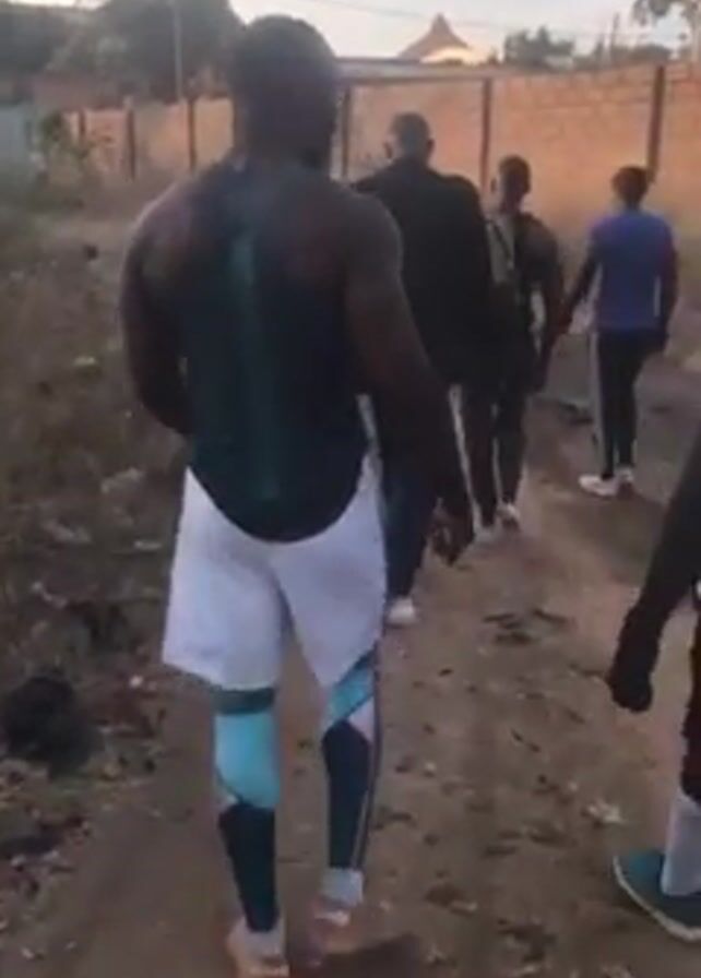 A group of people is walking away from the camera along a dirt path. There is a man in the front wearing a dark green tank top, white shorts and colorful compression leggings. He has well-defined muscles. There are several other men in the group, some wearing athletic attire. A brick wall lines the path on the right, with sparse vegetation on the left. The sky is light.