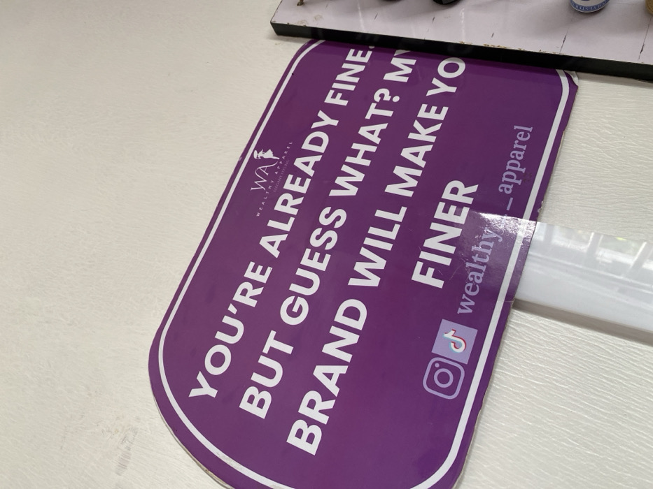 A purple sign with white text reads, "YOU'RE ALREADY FINE, BUT GUESS WHAT? MY BRAND WILL MAKE YOU FINER." It features a logo "WA WEALTHY APPAREL ELEGANT STYLING" in the upper left corner. Beneath the text, social media icons for Instagram and TikTok are visible, followed by "wealthy_apparel." The sign is likely a handheld promotional item. It is positioned on a white surface with another object partially visible in the upper right corner.