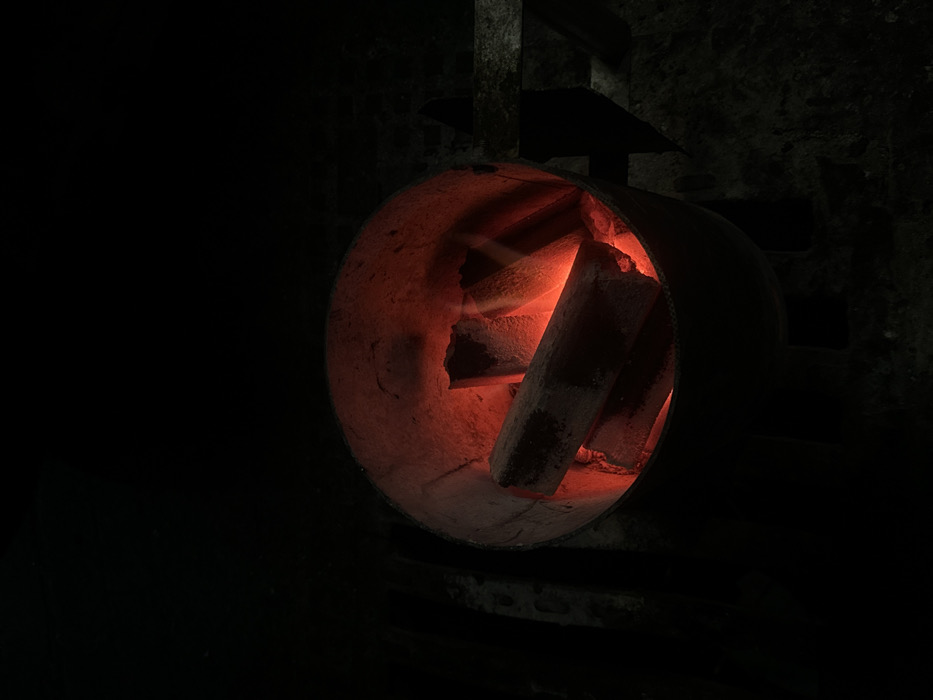 A metal cylinder is positioned in the foreground, radiating a fiery orange glow from within. Inside the cylinder, several dark, rectangular objects, possibly logs or bricks, are visible. The background is shrouded in darkness, with hints of stone texture on the walls. A set of angular, dark structures, resembling steps or shelves, is vaguely discernible above and behind the cylinder. The overall ambiance is shadowy and intense.
