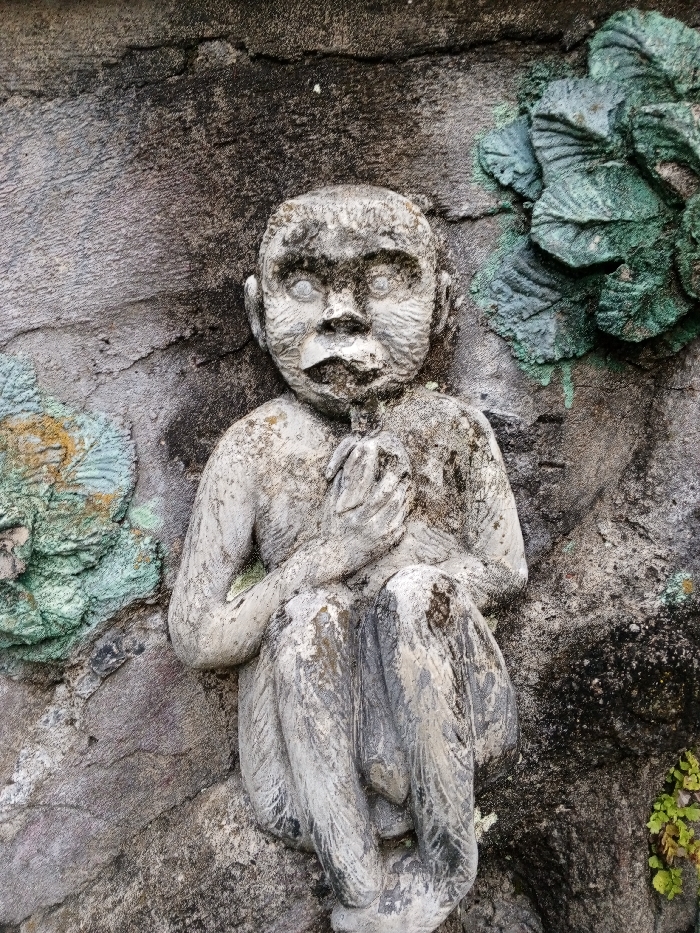 This image depicts a weathered stone relief carving of a humanoid figure, presumably located in Batheay, Cambodia. The figure, possibly representing a child or small being, is sculpted in a seated position with knees bent and hands clasped together near its chest. It features a round head with wide, prominent eyes, a broad nose, and an open, downward-curved mouth. The carving exhibits significant discoloration, varying from light gray to dark gray, with patches of green, yellow, and black organic growth, likely mold or lichen, covering its surface and accentuating its textured details. The figure is integrated into a rough, textured background, also appearing to be carved stone or concrete. Sculpted leaf-like or floral elements, exhibiting similar weathering and green-blue patination, are visible in relief to the upper right and lower left of the central figure. Minor green plant growth is present at the bottom right of the frame.
