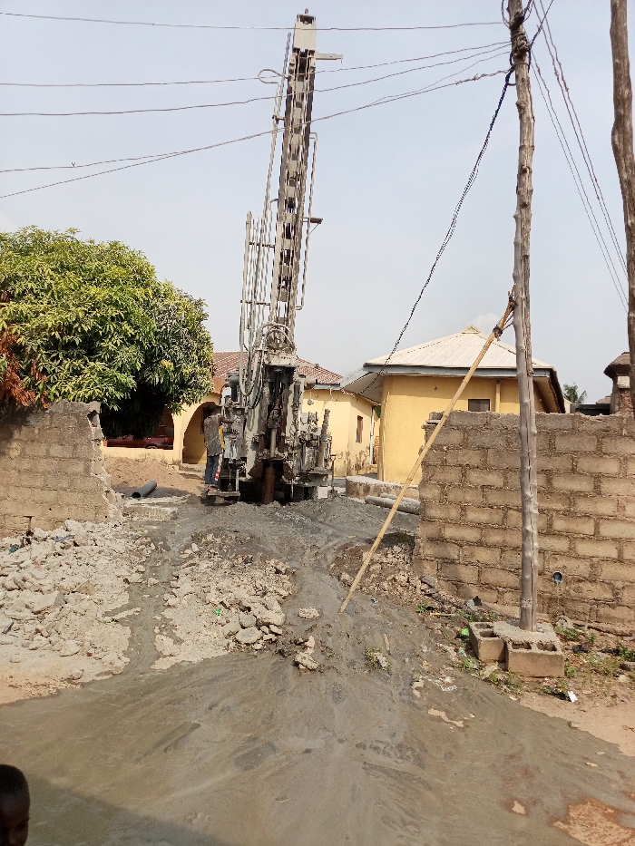 An overhead-drilling rig, with its mast extended upwards, is positioned centrally in a residential area of Zango-ndaji, Nigeria