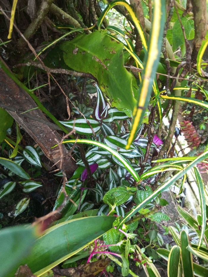 This image captures a dense entanglement of various plant species in Kotakonda, India. The foreground and midground are dominated by several clusters of *Tradescantia zebrina*, identifiable by their green leaves with prominent silvery-white stripes and purple undersides. Interspersed are broader, solid green leaves, one exhibiting a textured surface and an irregular, wavy edge in the upper left. Numerous slender leaves with yellow and green variegation crisscross the frame, particularly along the right and upper edges. A thick, dark brown wooden branch or log runs diagonally from the upper left towards the mid-left. Various thinner, dark brown stems, some appearing thorny, are interwoven among the foliage. Towards the upper right, a reddish, segmented inflorescence is partially visible amidst the dense growth. The scene is static, devoid of human or animal figures, depicting a rich, overgrown botanical environment.