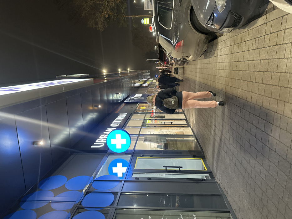 A woman in pink pants and a black jacket walks on a brick sidewalk. She has a backpack on and is walking in front of a building with a blue cross sign that says "URRAN OPTIKA." The building has large glass windows. Several cars are parked nearby. Other people are walking farther down the sidewalk. The streetlights are on, suggesting that it is nighttime.