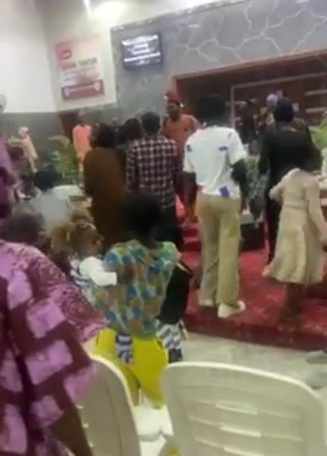 group of people, including adults and children, gathered in what appears to be a church or large meeting hall. Many are standing on a red carpeted area towards the front of the room. There are white plastic chairs lining the sides. Some individuals are dressed in casual clothing, while others are wearing more formal attire, including traditional African prints. There is a large screen visible in the background displaying text, and a banner on the left side of the room with writing on it. The overall atmosphere appears lively, with some people moving and interacting with each other.