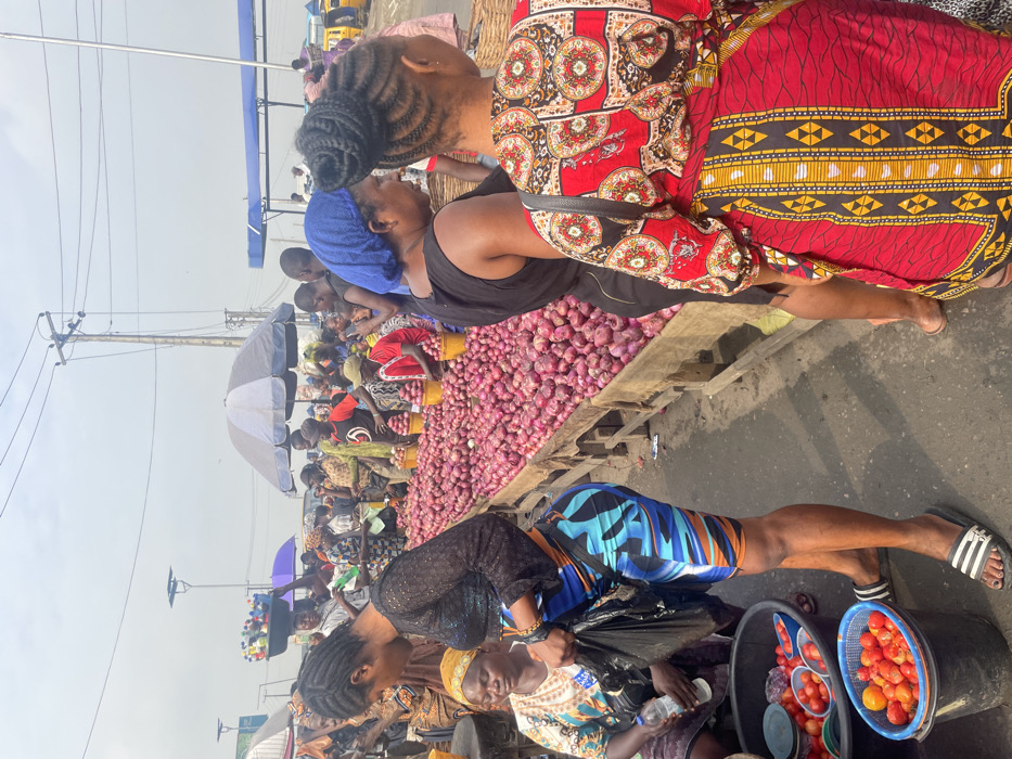 This image depicts a bustling outdoor market scene in Ebute-Metta, Nigeria