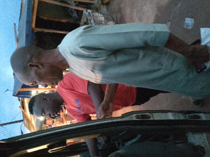 Two men stand by a car. One wears a white shirt and bald head, gazing downward. The other, slightly behind, sports a red shirt with writing and a close-cropped haircut. The car's interior is visible, showing door panels and seats. The scene is outdoors, possibly a roadside, with background structures and indistinct figures. The lighting suggests dusk or dawn. The image is slightly tilted, with notable graininess.