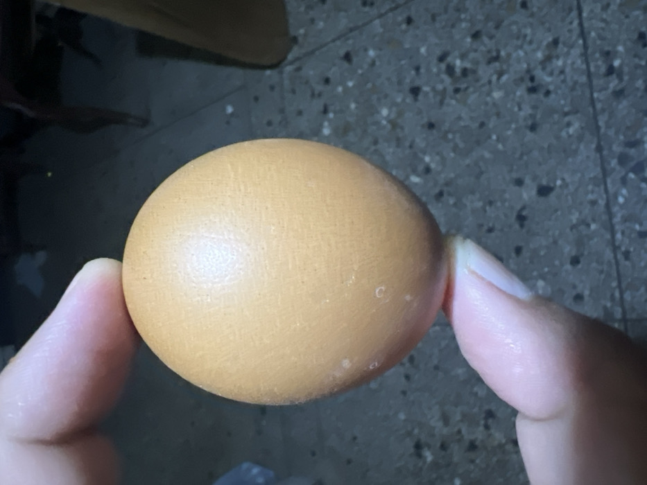 A brown chicken egg is held between a thumb and index finger. The egg shows slight texture and minor blemishes. The background features a section of flooring, possibly tile, with a speckled grey pattern. The color and shape of the egg suggest it is a typical hen's egg, held up for closer examination.