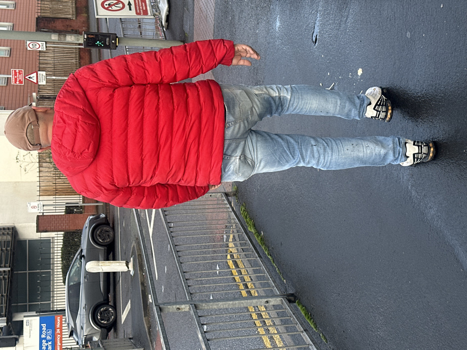 An individual, viewed from behind, walks on a wet asphalt sidewalk towards the upper right of the frame, past a metal pedestrian barrier. The person wears a red hooded puffer jacket, light blue distressed jeans, light-colored athletic shoes with black and gold accents, and a beige baseball cap. Green moss lines the base of the pedestrian barrier, separating the sidewalk from the road. The road features double yellow lines and white markings. To the left, a dark grey SUV is visible. In the background, a blue sign indicates "Manchester University NHS" and "Hathersage Road Park" with "Emergency 24 Hours". A pedestrian traffic light shows a green man, and various road signs are visible, including "10 ZONE", "NO PARKING", and a "NO ENTRY" sign. The scene depicts a city street in Manchester, United Kingdom, specifically near the Hathersage Road Park and Manchester University NHS facilities.
