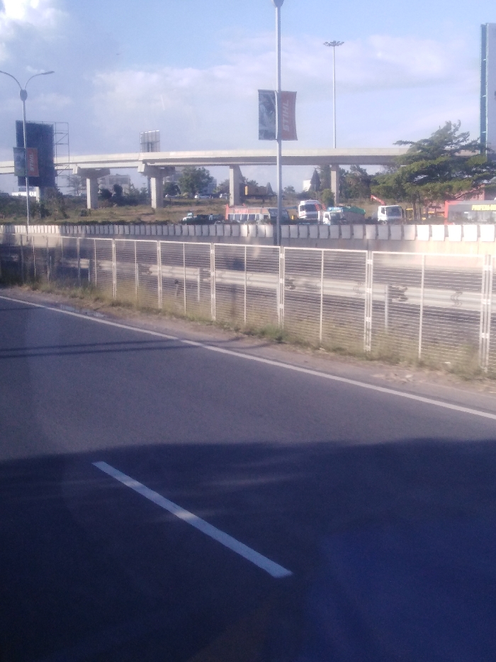 A road with a white line marking is in the foreground. Parallel to the road is a metal fence. Beyond the fence, a concrete wall supports an overpass bridge structure. Multiple vehicles, including trucks, are visible on the other side of the wall. Lamp posts and billboards with a "STIHL" logo are positioned along the roadside. A tree is visible in the distance near the overpass. The sky is bright with some clouds.