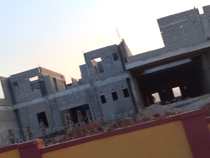 A building under construction is depicted in the image. The structure is made of gray blocks and features rectangular openings that suggest windows and doorways. Construction scaffolding is visible in front of the building. A barrier painted with yellow and maroon stripes runs across the foreground. The sky is a gradient of light colors, indicating either dawn or dusk.