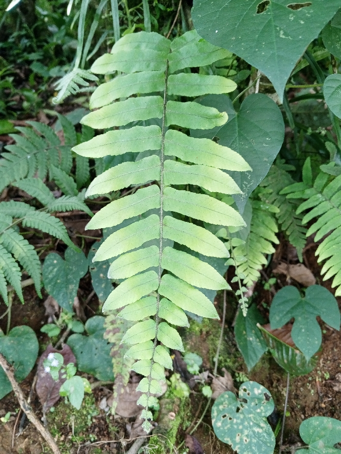The scene depicts a close-up of natural vegetation in Ciherang, Indonesia. A single, prominent light-green pinnate fern frond is centered vertically, displaying numerous elongated pinnae symmetrically arranged along a dark central rachis. Surrounding this central subject, various other green plant forms are visible. To the left and upper right, darker green, finely dissected fern fronds are present. On the right side, larger, heart-shaped leaves, some exhibiting small perforations or light discoloration, are observed. The lower portion of the image shows areas of dark brown soil interspersed with smaller green foliage and moss-like growth. No human figures or man-made objects are present.