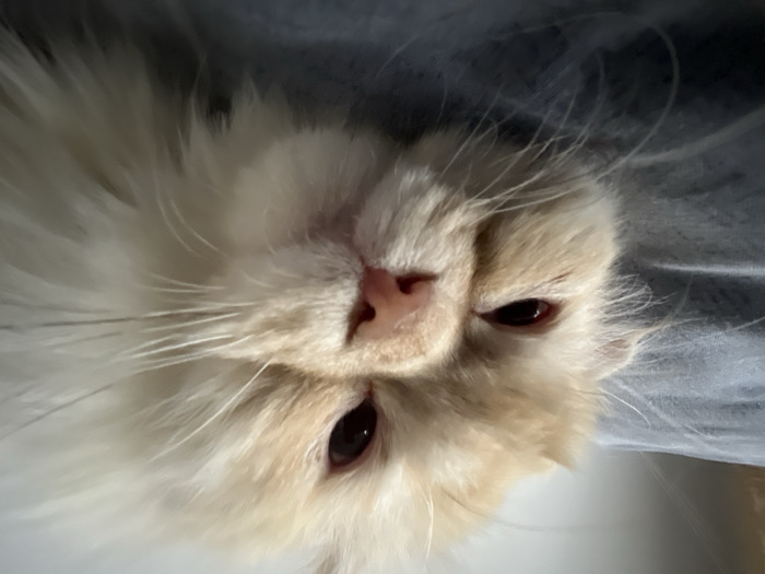 - "A close-up, eye-level photograph depicts a cream and white long-haired cat, possibly a Persian or Ragdoll breed, resting on a textured, grey-blue fabric surface in Navoiy City, Uzbekistan" by FM-RkAm93, licensed under CC BY 4.0