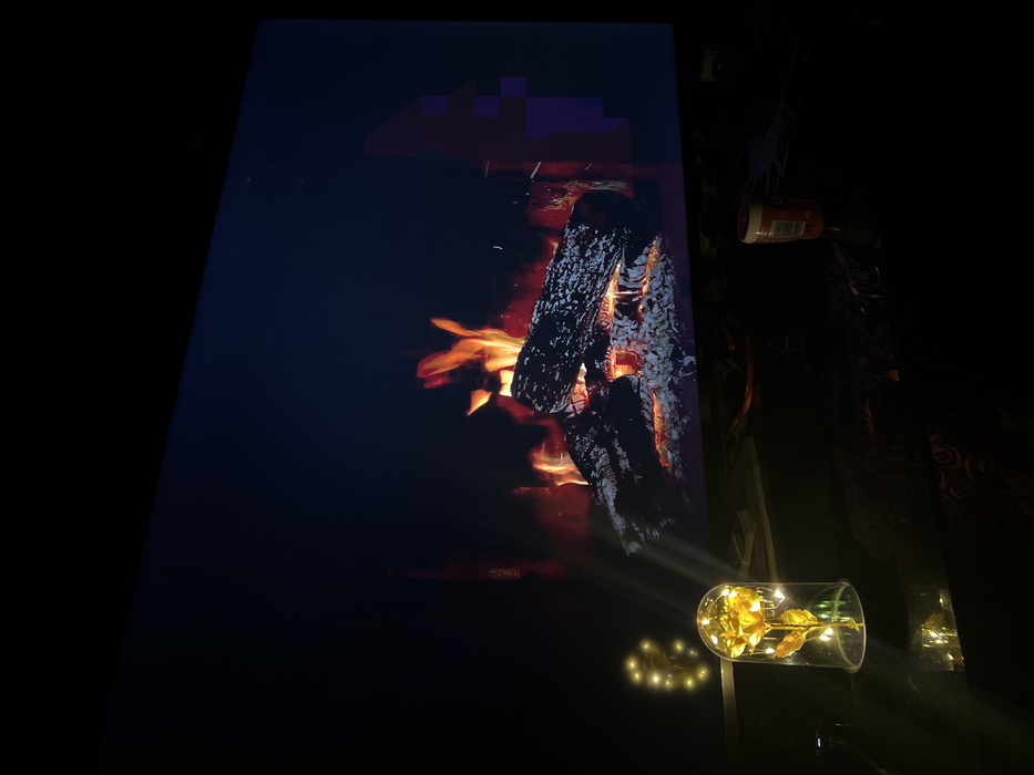 The scene depicts an indoor environment in Kribul, Bulgaria, characterized by low light conditions. A large electronic display screen dominates the background, actively presenting a digital image of a burning fireplace with glowing logs, embers, and vibrant flames. The right-hand portion of this digital display exhibits vertical pixelated artifacts, appearing as reddish-purple blocks. In the left foreground, positioned on a dark, reflective surface, is a clear glass cloche housing a golden rose illuminated by internal warm white LED string lights. Reflections of these lights are visible on the surface behind the cloche. To the right on the same dark surface, a cylindrical container with an orange label is partially visible in an upright position. No individuals are present in the frame.