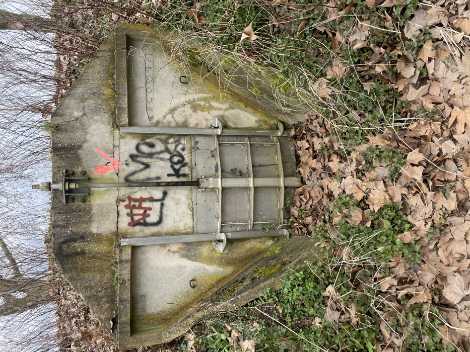 The image depicts a concrete water control structure, specifically a sluice gate mechanism, situated within an earthen bank in Holtzheim, France