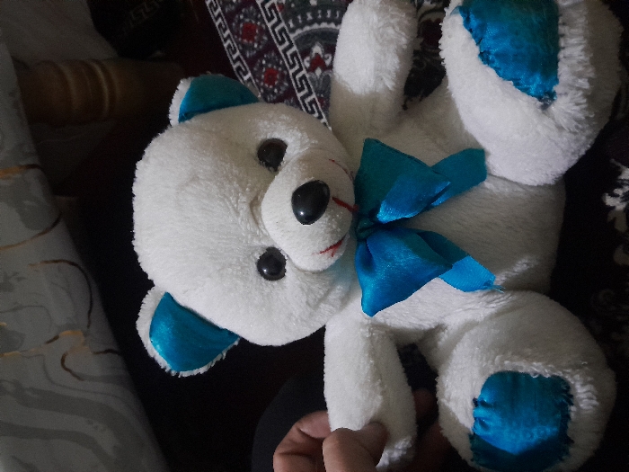 An indoor residential setting in Seytaul, Uzbekistan. A white plush teddy bear is centrally positioned and seated. The bear features black bead eyes, a black plastic nose, and a red stitched mouth. Its inner ears, the pads of its front paws, and a satin bow tied around its neck are all bright blue. A human hand, with light-toned skin, is partially visible on the left, grasping the teddy bear's left arm. The bear sits on a dark-colored patterned textile, likely a rug, displaying red and grey geometric designs. In the background, a light-brown, carved wooden furniture leg is partially visible on the right, and a wall covering with a wavy, abstract pattern is on the upper left. The scene is lit from an unseen source, consistent with an indoor environment.