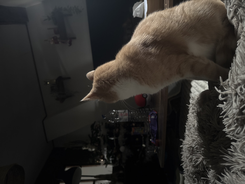 - "An orange and white cat is depicted sitting on a light gray, textured blanket, oriented with its back to the viewer and head turned towards the left of the frame" by FM-xTDQG2, licensed under CC BY 4.0