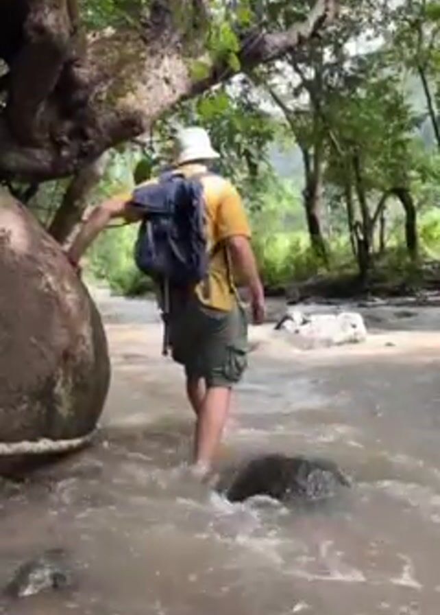 A man is walking barefoot through a shallow river in a forest. The water is murky. He wears a yellow shirt, olive shorts, a white hat, and a blue backpack. He is using a large boulder on his left for support. Trees surround the river.