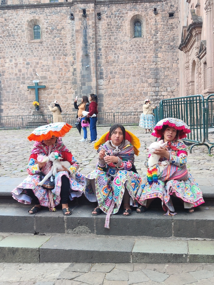 Three traditionally dressed Peruvian women sit on stone steps in front of a large stone building