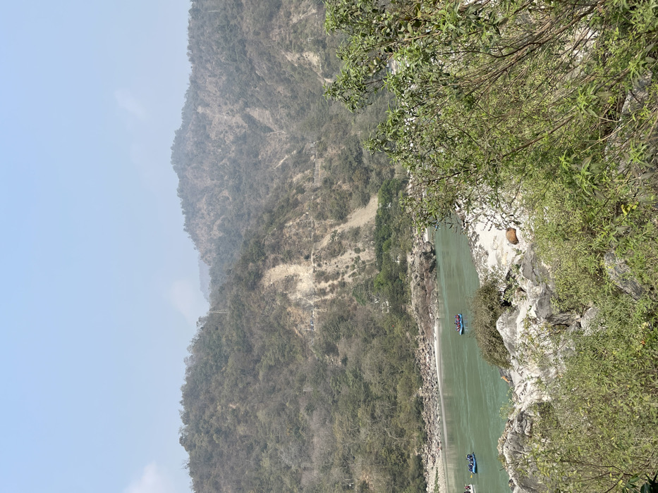 This image depicts an elevated view of a river valley in Jonk, India. The sky is light blue with a faint haze. In the background, multiple layers of large hills or mountains are visible, predominantly covered in sparse, dry green and brown vegetation, with significant patches of exposed light-colored earth and rock indicating erosion or geological features. A winding path or road is discernible on the mid-slope of the mountain to the left. In the midground, a wide river with greenish-blue water flows from the left towards the center-right. Two blue inflatable rafts are present on the water. One raft is in the mid-right section of the river, containing approximately 6-8 individuals. Another raft is partially visible towards the far left edge, also with several individuals aboard, all engaged in a river activity. The riverbanks are a mix of light-colored sand or pebbles and dark rocks. The immediate foreground is dominated by dense, green leafy bushes and small trees, partially obscuring the rocky ground. No direct interactions between the rafts are observable.