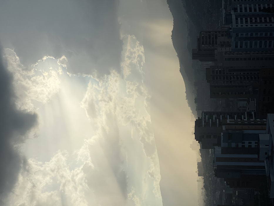 An urban landscape meets a dramatic sky. High-rise buildings dominate the right, fading into a hazy distance. A mountain silhouette parallels the cityscape. The left side features heavy, textured clouds, illuminated by strong, diffused sunlight. Light rays stream through breaks in the cloud cover, creating a dynamic contrast with the shadowed mountain and city. The overall atmosphere is striking and atmospheric.