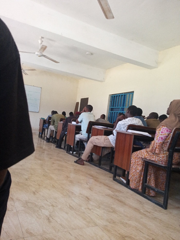 The image displays the interior of a classroom or lecture hall located in Hayin Banki, Nigeria