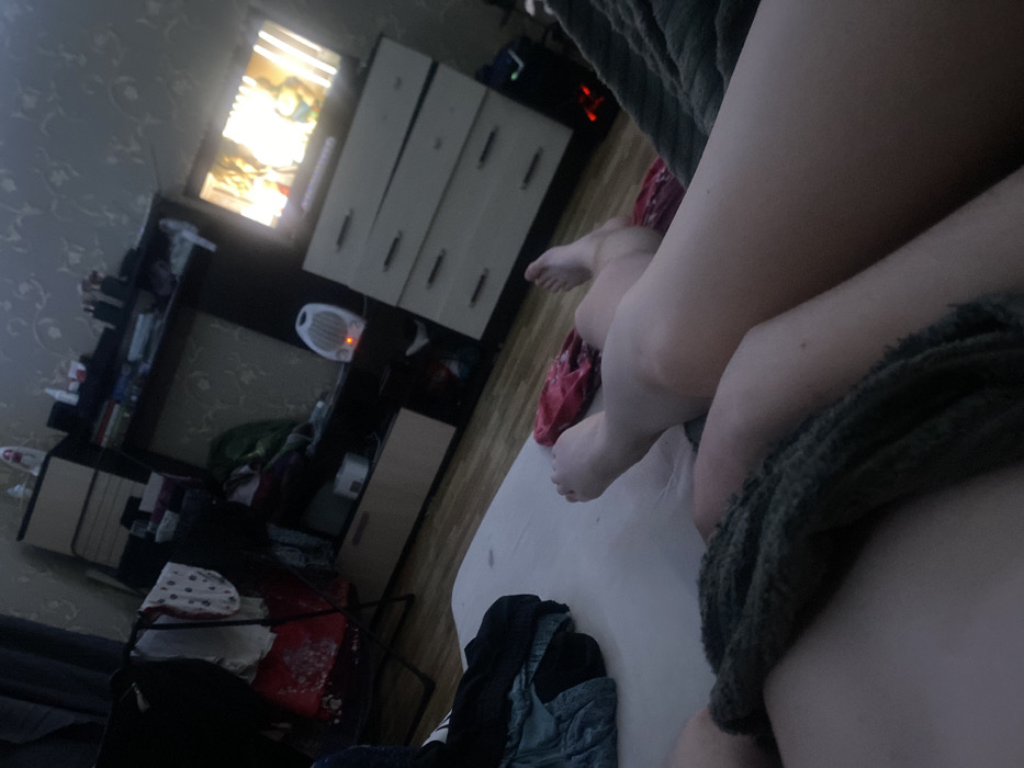 This image depicts an indoor residential scene in Saratov, Russia, observed from a first-person perspective. The foreground shows the bare legs of an individual lying on a white mattress, with a dark green, ribbed blanket or garment partially covering the upper left leg. To the immediate left on the mattress, a pile of dark blue and green folded clothing is visible. The background reveals a dimly lit room with light-colored wallpaper featuring a subtle patterned design. The floor consists of light-toned wooden floorboards or laminate. A multi-section modular furniture unit spans the far wall. From left to right, a dark wardrobe or tall shelving unit is partially obscured by clothes draped over a chair or rack, displaying black, white-patterned, and red garments. To its right, a dark brown and light beige shelving unit holds various unidentifiable objects. On one shelf, a white, active fan-heater with an orange glowing element is visible. Further right, a light beige chest of drawers supports a flat-screen television displaying an animated scene with yellow and orange visual elements. To the lower right of the chest of drawers, a dark object, likely a computer tower, exhibits illuminated red components. The primary light sources are the television screen and the glowing fan-heater.