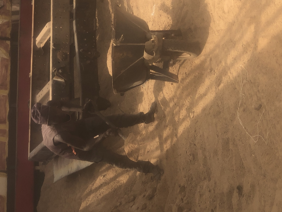 A male individual, dressed in a dark short-sleeved shirt, dark trousers, and a dark patterned cap, is depicted actively shoveling sand. He is positioned left of center, leaning forward with a shovel in his hands, scooping material from a large pile of light-brown sand. To the right of the individual, a dark-colored wheelbarrow is visible, partially filled with similar sand. Behind the individual and the wheelbarrow, the dark, skeletal frame of a large vehicle chassis or truck frame is present. The ground is a uniform light-brown sandy soil, with shadows cast by unseen objects or structures extending from the lower right. The scene is illuminated by an overhead light source, creating distinct shadows. In the upper background, faint colors suggest a building or structure with red and yellow hues. The overall environment appears to be an outdoor worksite in Tukur Tukur, Nigeria, characterized by construction materials and activity.