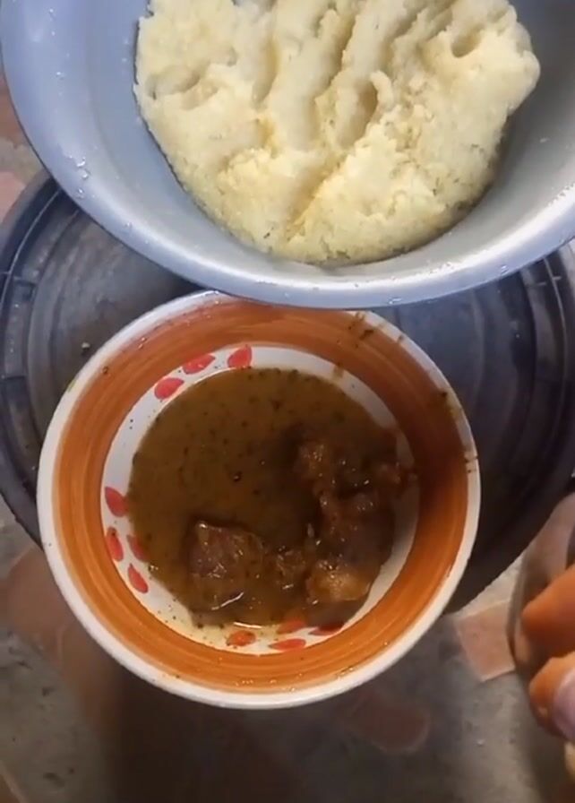 A close-up shot shows a bowl of light-colored, grainy food, possibly mashed cassava or yam, placed on top of another bowl containing a brown stew with pieces of meat