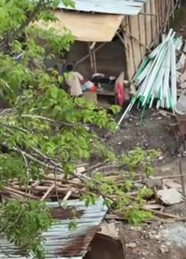 The scene shows a person cooking in a makeshift outdoor kitchen or shed. The structure appears to be constructed from wood, corrugated metal, and other materials, with an open front and simple shelving. The person is facing away from the camera and is visible from the waist up, wearing a light-colored shirt. They are working at a counter with a pan and other cooking utensils. Around the structure are various materials including bamboo sticks, plastic pipes, and pieces of rubble or debris, suggesting ongoing construction or disrepair. Green foliage is visible in the foreground, partially obscuring the view of the scene.