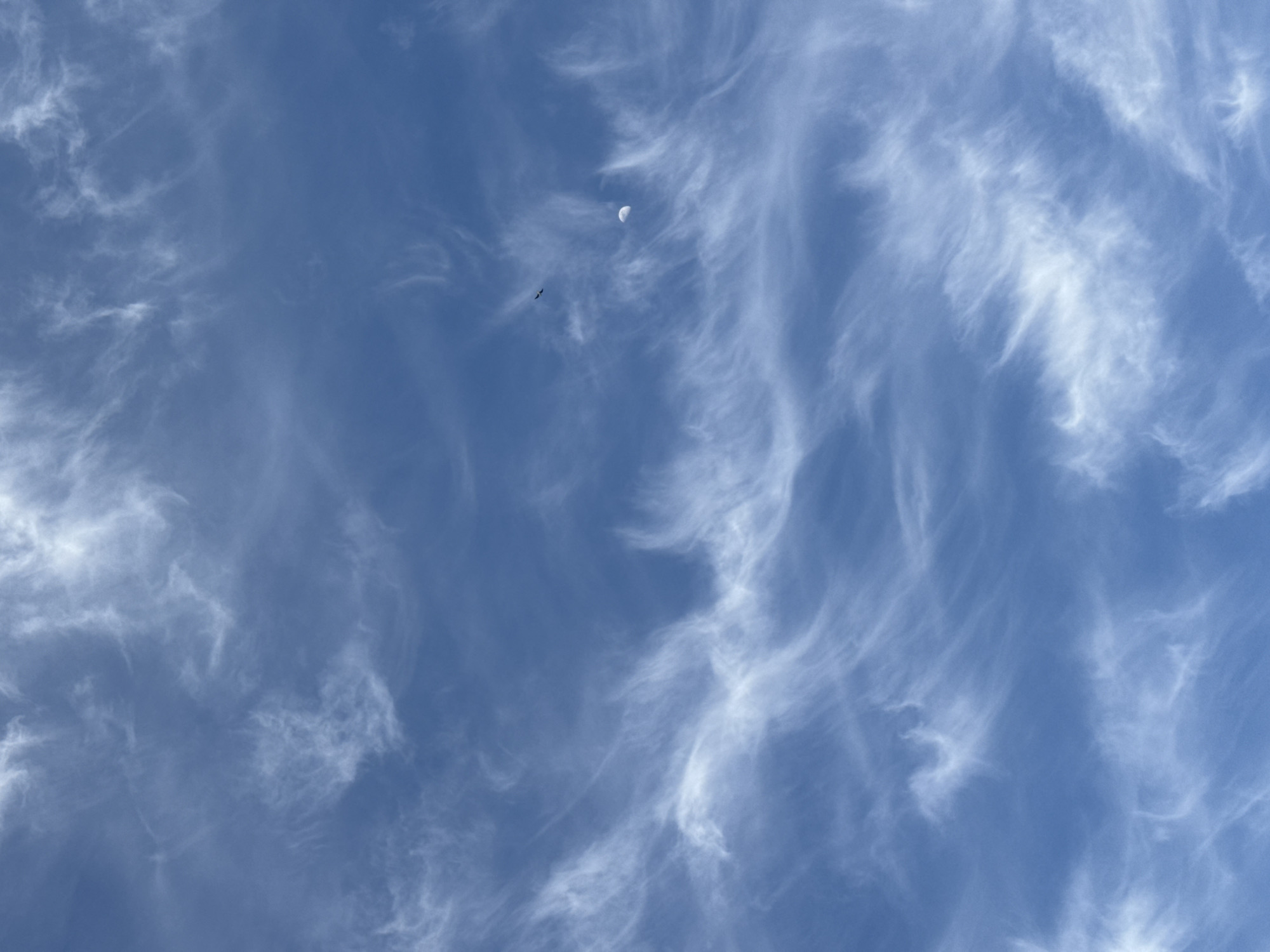 The image displays a clear blue sky filled with extensive, wispy white cirrus clouds stretching across the entire frame. In the upper-right quadrant, a crescent moon, illuminated on its right side, is visible. Above and slightly to the left of the moon, a small, dark, silhouetted bird with outstretched wings is depicted in flight. The scene is located in the city of Moscow, Russia. No people, ground structures, or specific interactions are present within the captured view.