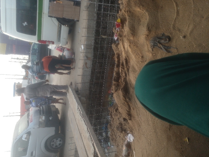 The image depicts a roadside scene in Lekki, Nigeria, characterized by ongoing construction alongside active pedestrian and vehicular traffic